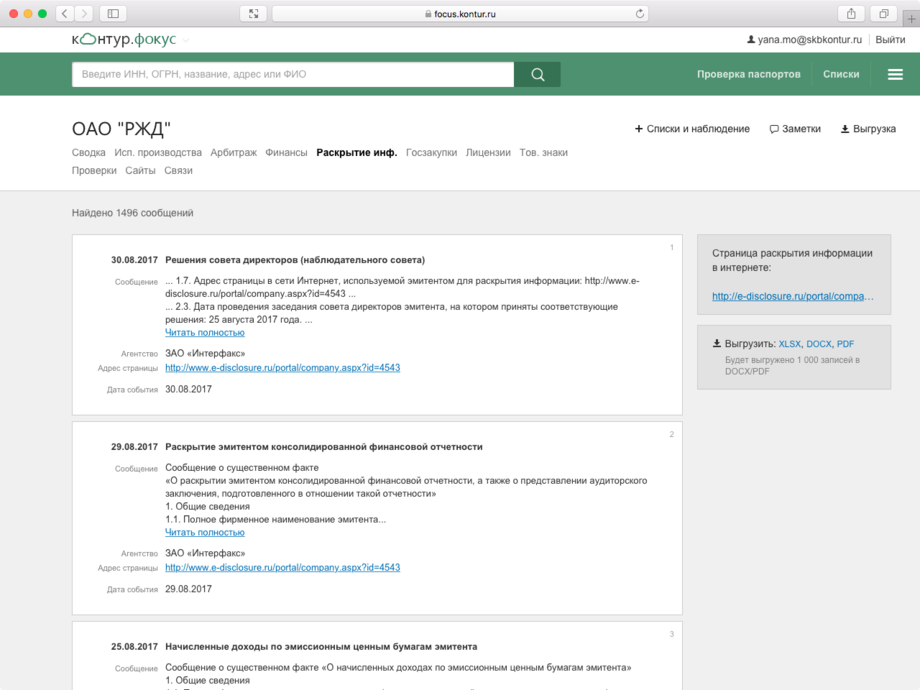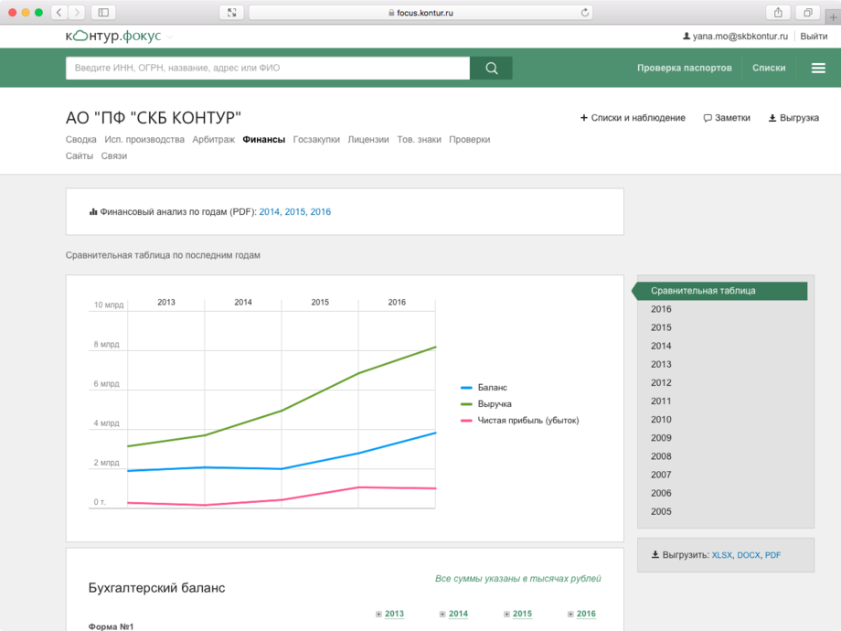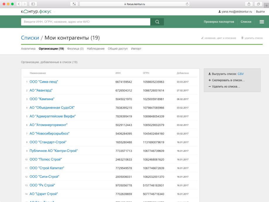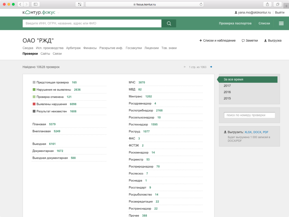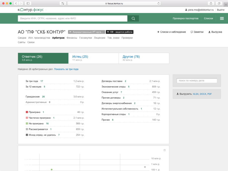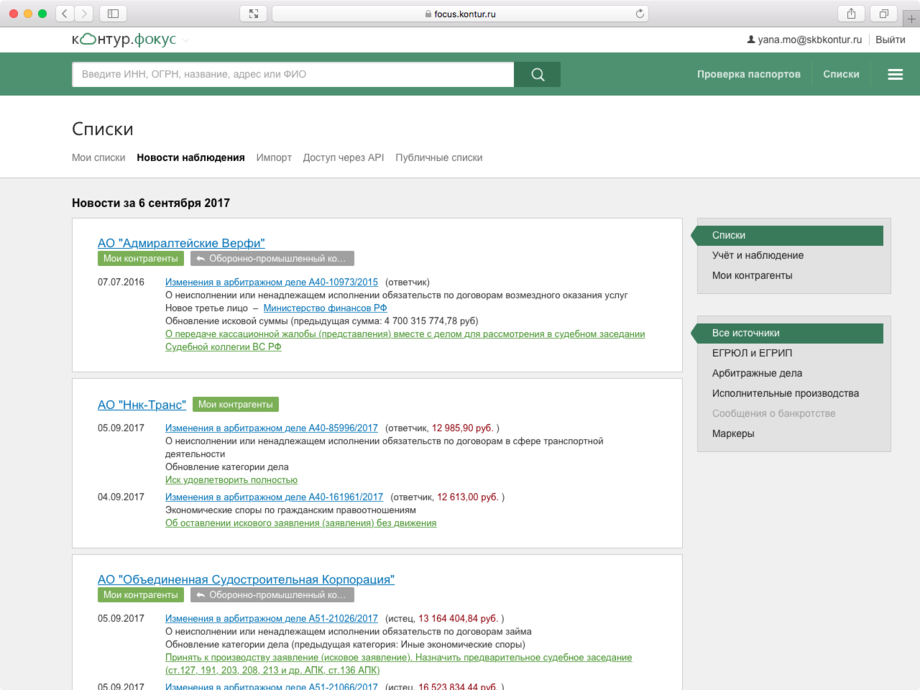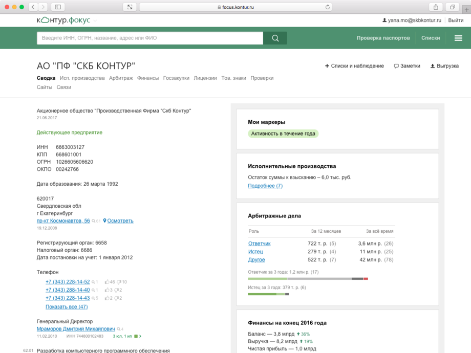 Все данные о контрагенте собраны на одном экране: сведения из ЕГРЮЛ/ЕГРИП, арбитражные дела, выигранные госконтракты, информация о банкротстве и долгах, адреса массовых регистраций и многое другое.