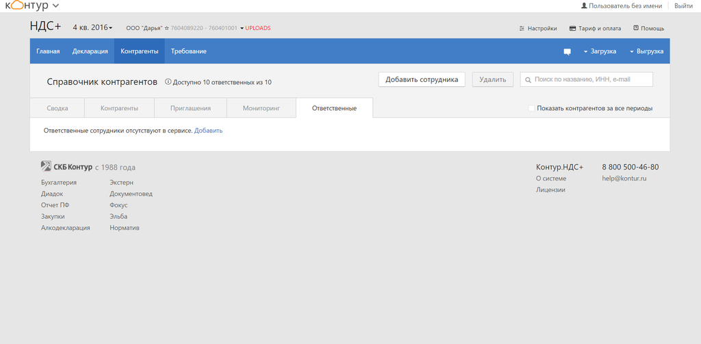 С Контур.НДС+ главный бухгалтер может делегировать сверку коллегам. Для этого нужно купить нужное количество дополнительных мест и завести ответственных на вкладке «Ответственные».