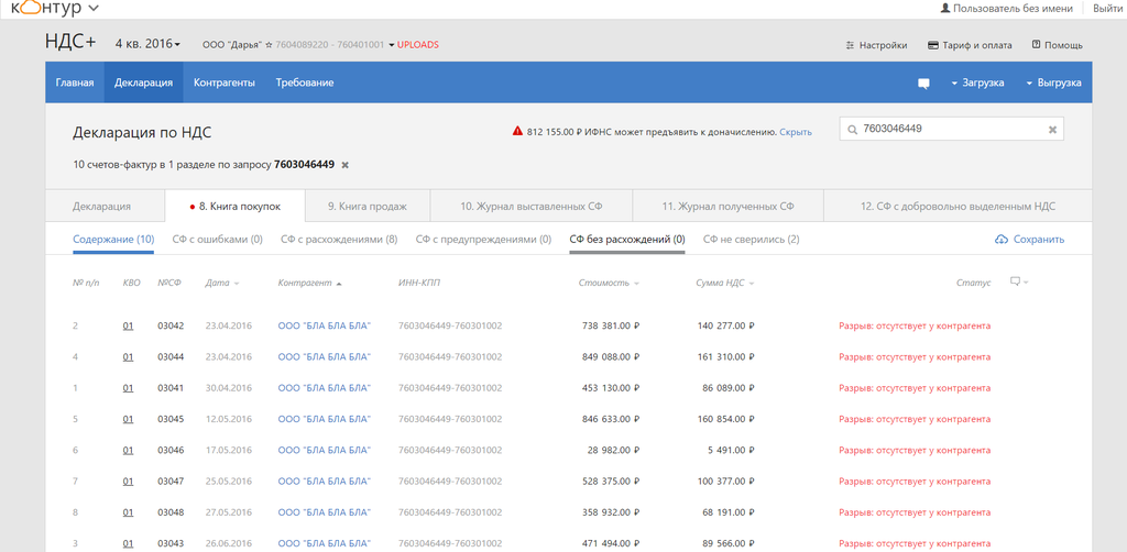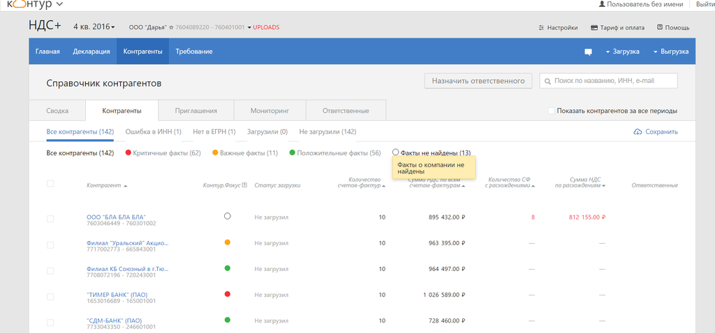 Чтобы увидеть список счетов-фактур, кликните по названию компании, Перейти на конкретный раздел декларации можно через карточку контрагента.