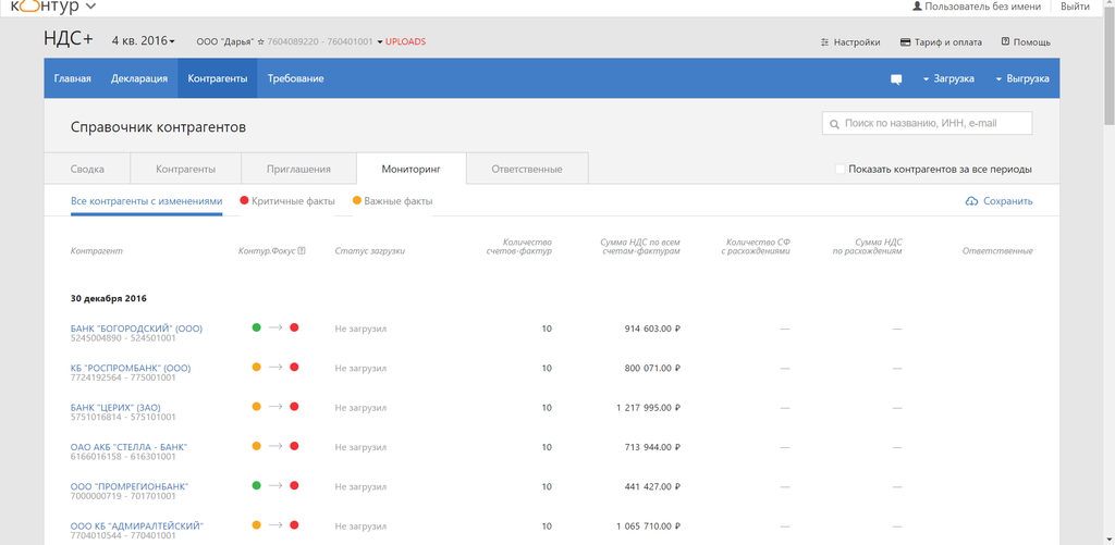 На новой вкладке «Мониторинг» вы можете отслеживать, как меняются статусы компаний (с датами изменений) и своевременно принимать меры для проявления должной осмотрительности.