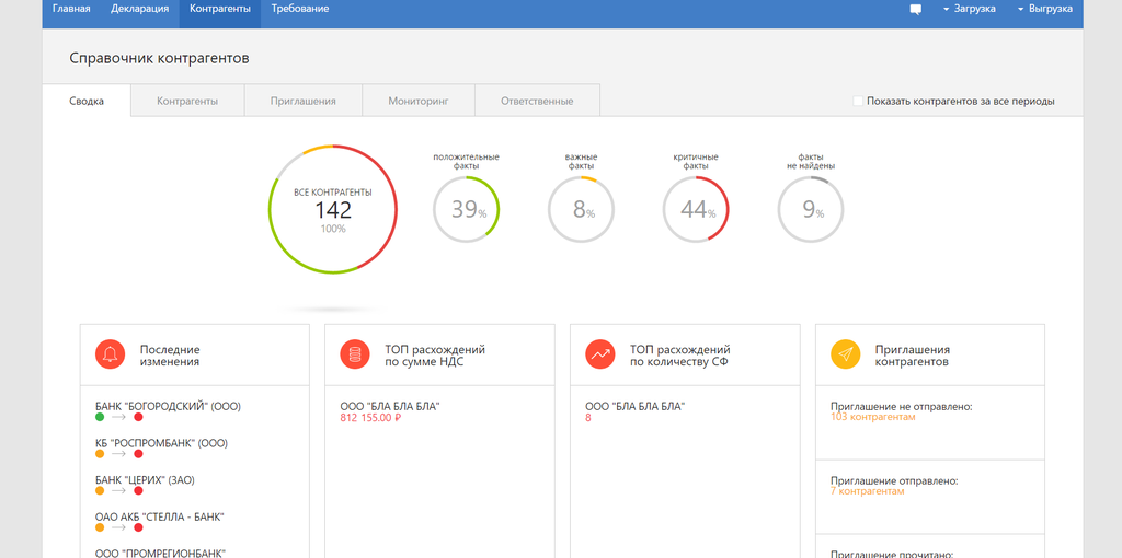Когда вы переходите в справочник, то попадаете на вкладку «Сводка». Здесь вы можете сразу оценить ситуацию с контрагентами, увидеть последние изменения, проблемных с точки зрения сверки контрагентов и т.д. Найдя проблемные места, вы можете перейти в нужный вам раздел справочника.
